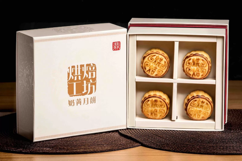 每個月餅獨立包裝,方便與親友分享。禮盒內有兩層,每層放四個月餅設計。