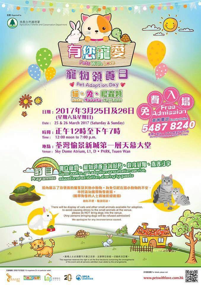 由漁農自然護理署主辦的「寵物領養日」。當日會有攤位遊戲、領養咨詢、教育展覽、嘉賓分享環節等,讓小朋友和公眾人士更了解寵物領養係點樣嘅一回事。現場更會有待人領養的貓、兔和爬蟲類動物,有興趣的市民可免費領養。