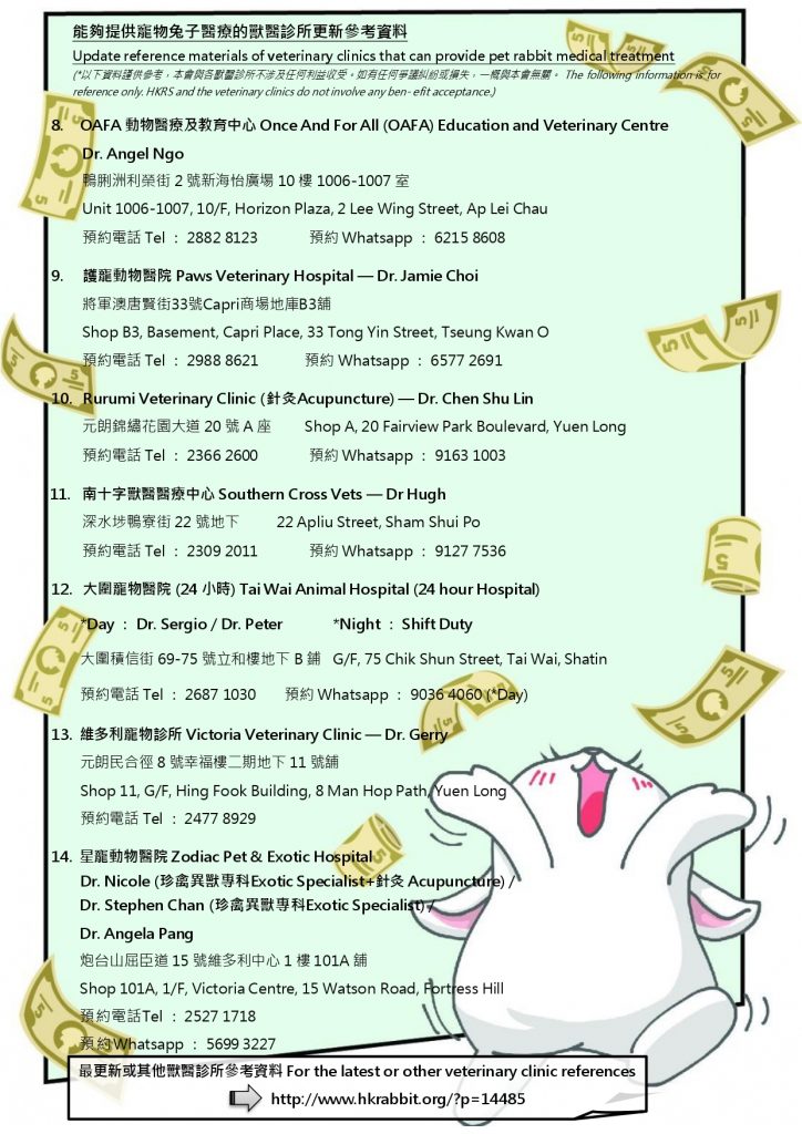 能夠提供寵物兔子醫療的獸醫診所更新參考資料 (不定期更新) / Update reference materials of veterinary clinics that can provide pet rabbit medical treatment (updated from time to time)