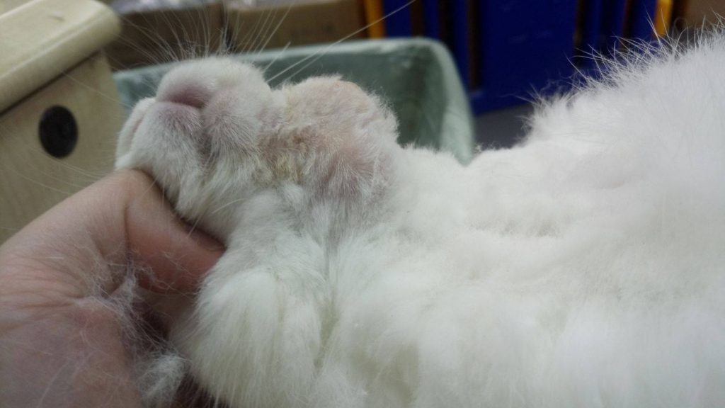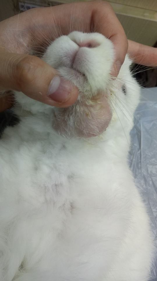 #2116 Fan Fan / 混侏 / 年齡不詳 / 女 / 好心人於網上社交平台見到有人執到兔但不能繼續留在家中而求助, 好心人接到兔兔後發現有嚴重下顎膿包問題, 需要即時交由兔協處理 (兔兔的下顎膿包已爆, 職員清理好傷口, 同時發現手臂亦有傷口, 而且過瘦, 已預約睇醫生)