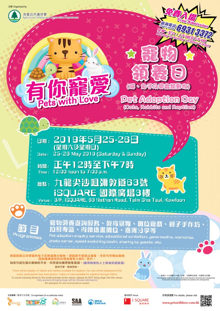現場將展示待領養的兔子及爬蟲類小動物。現場將不會展示貓隻,市民可參閱由動物福利機構提供的待領養貓隻之相片 / 短片。為免引起在場小動物的不安,市民請勿攜帶狗隻進場(攜帶狗隻的人士將被拒絕進場)。如有不便,敬請見諒。