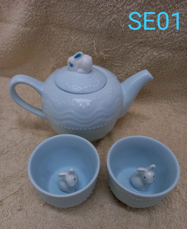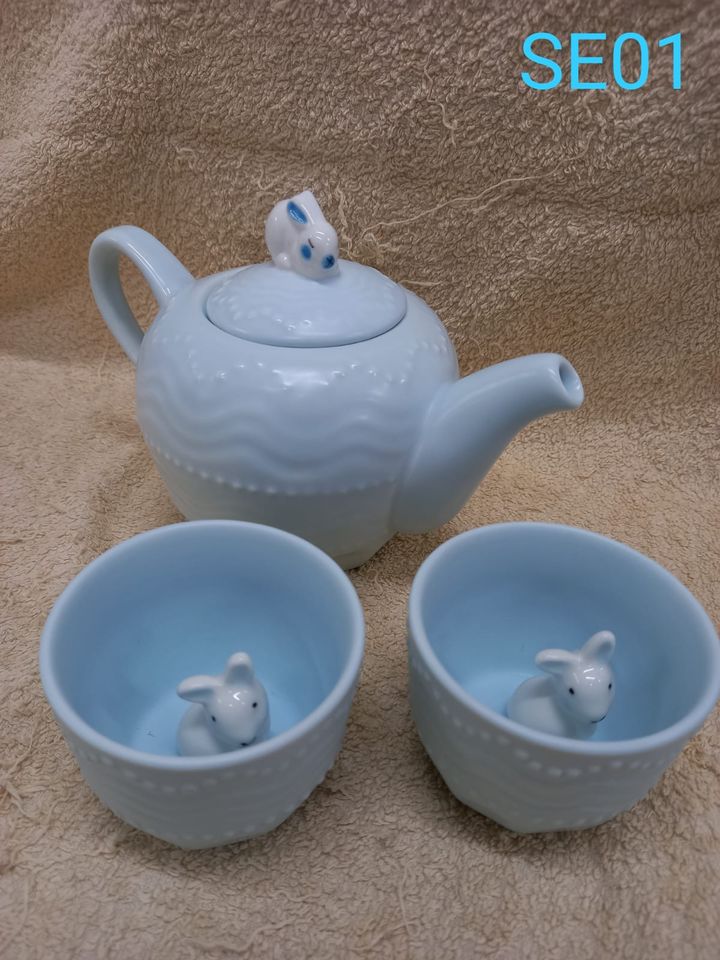 SE01 蕾絲兔子陶瓷茶具套裝一壺兩杯帶托盤(藍色) HKD130.-