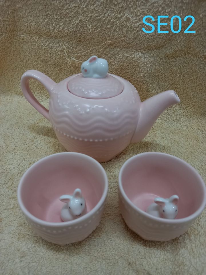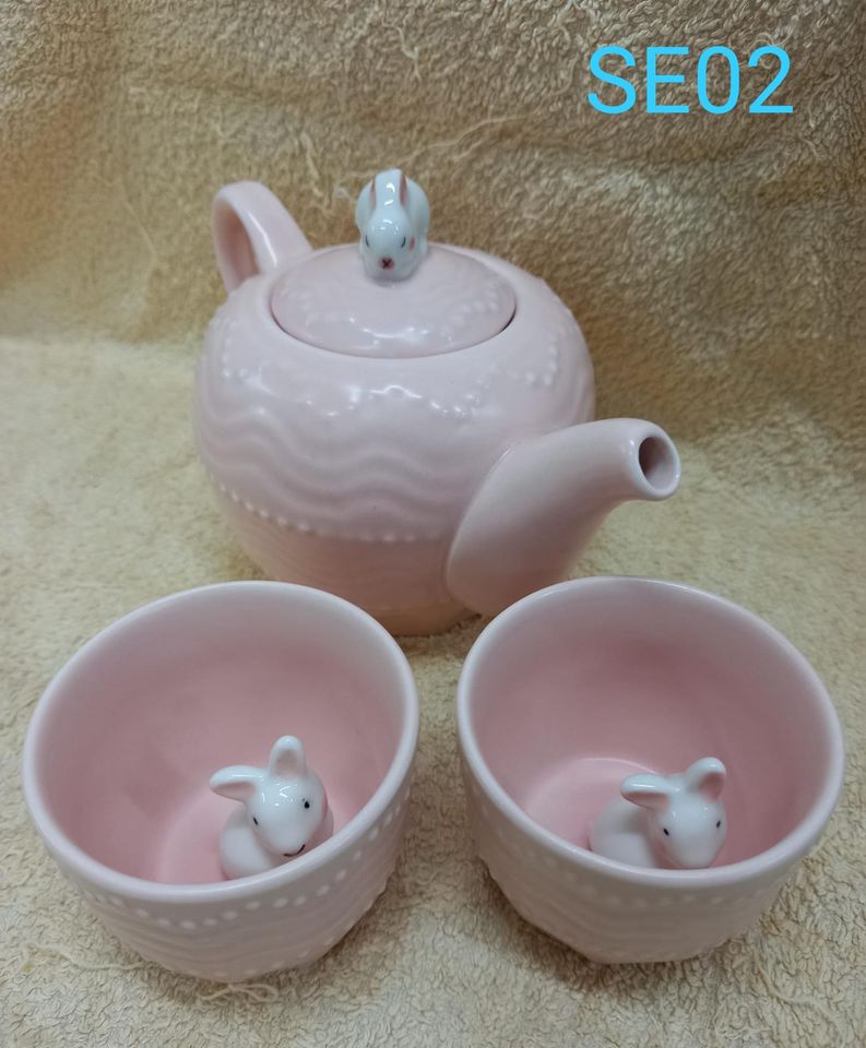 SE02 蕾絲兔子陶瓷茶具套裝一壺兩杯帶托盤 (粉紅色) HKD130.-
