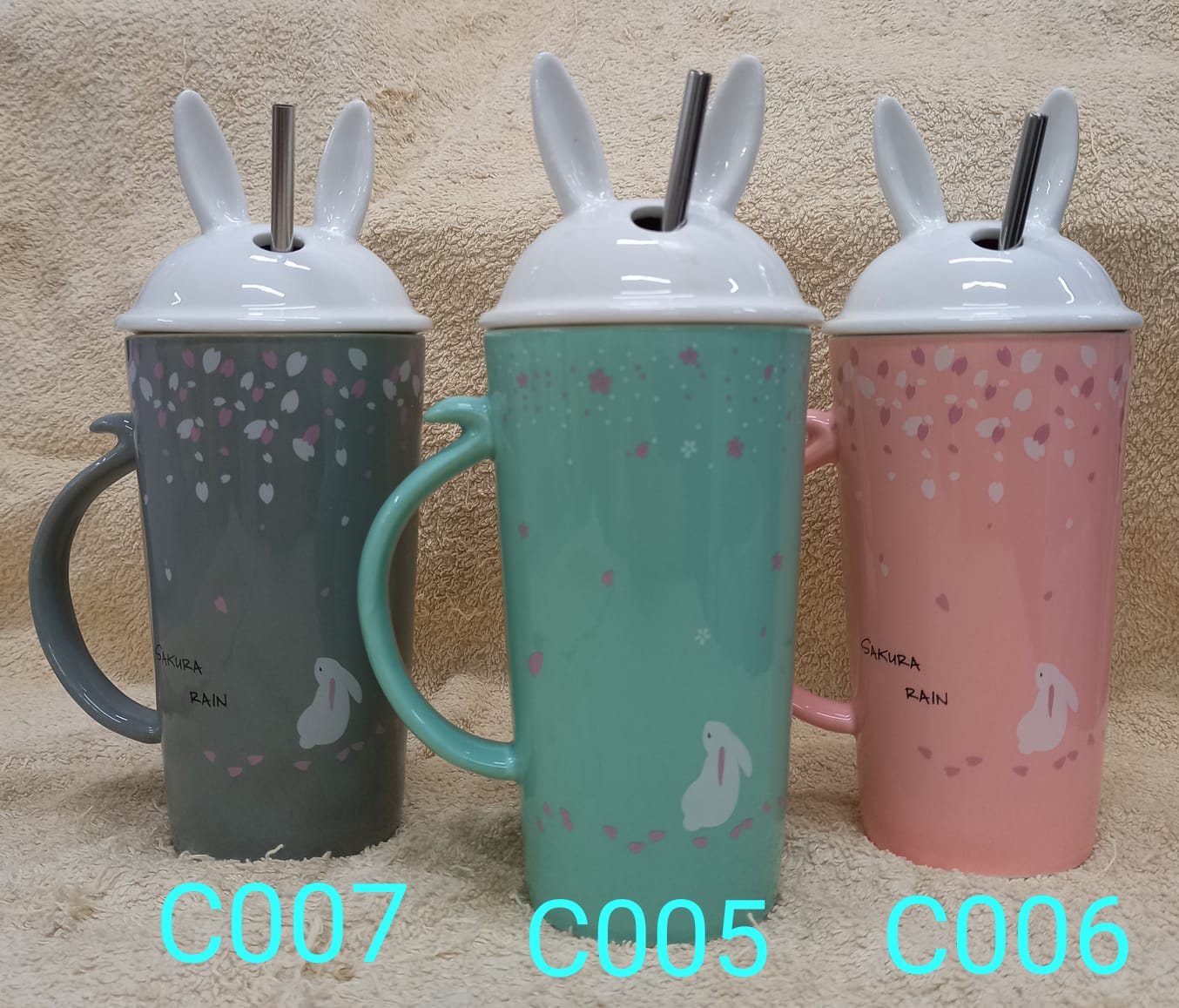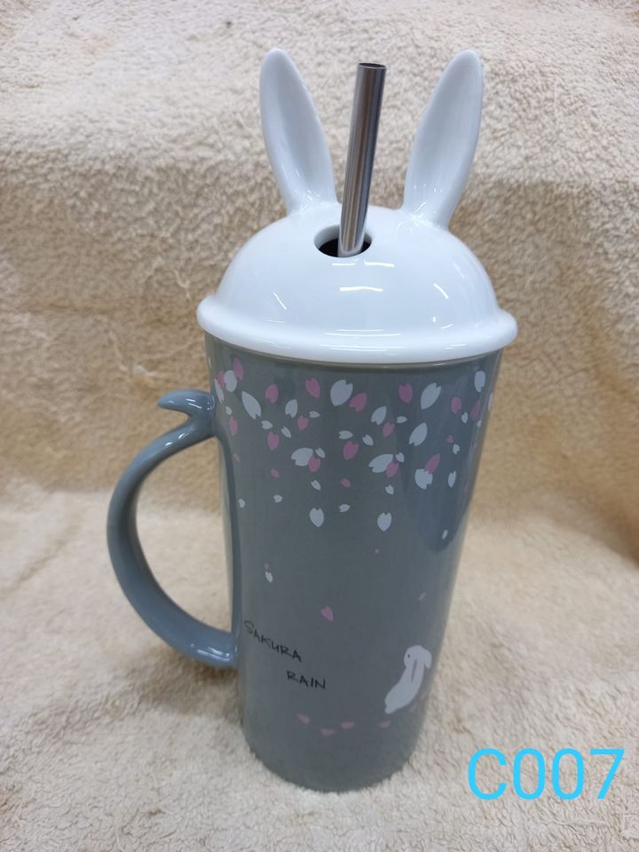 C007 兔子吸管陶瓷杯馬克杯(灰色) HKD50.-