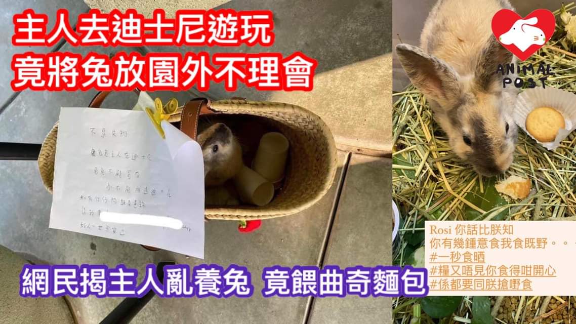 【動物專訊】一名不負責任的主人,竟在去迪士尼遊玩時,將兔兔放籃中放置在園外不顧,只留下附電話的字條解釋兔兔不准進園內,並非失物。有網民發現該主人的社交媒體顯示她將兔放於滿布紙筒等雜物的膠箱養,更曾餵兔吃曲奇、麵包等人的食物。香港兔友協會Shirley批評該主人不負責任,犯下嚴重錯誤,令兔兔置身危險之中。