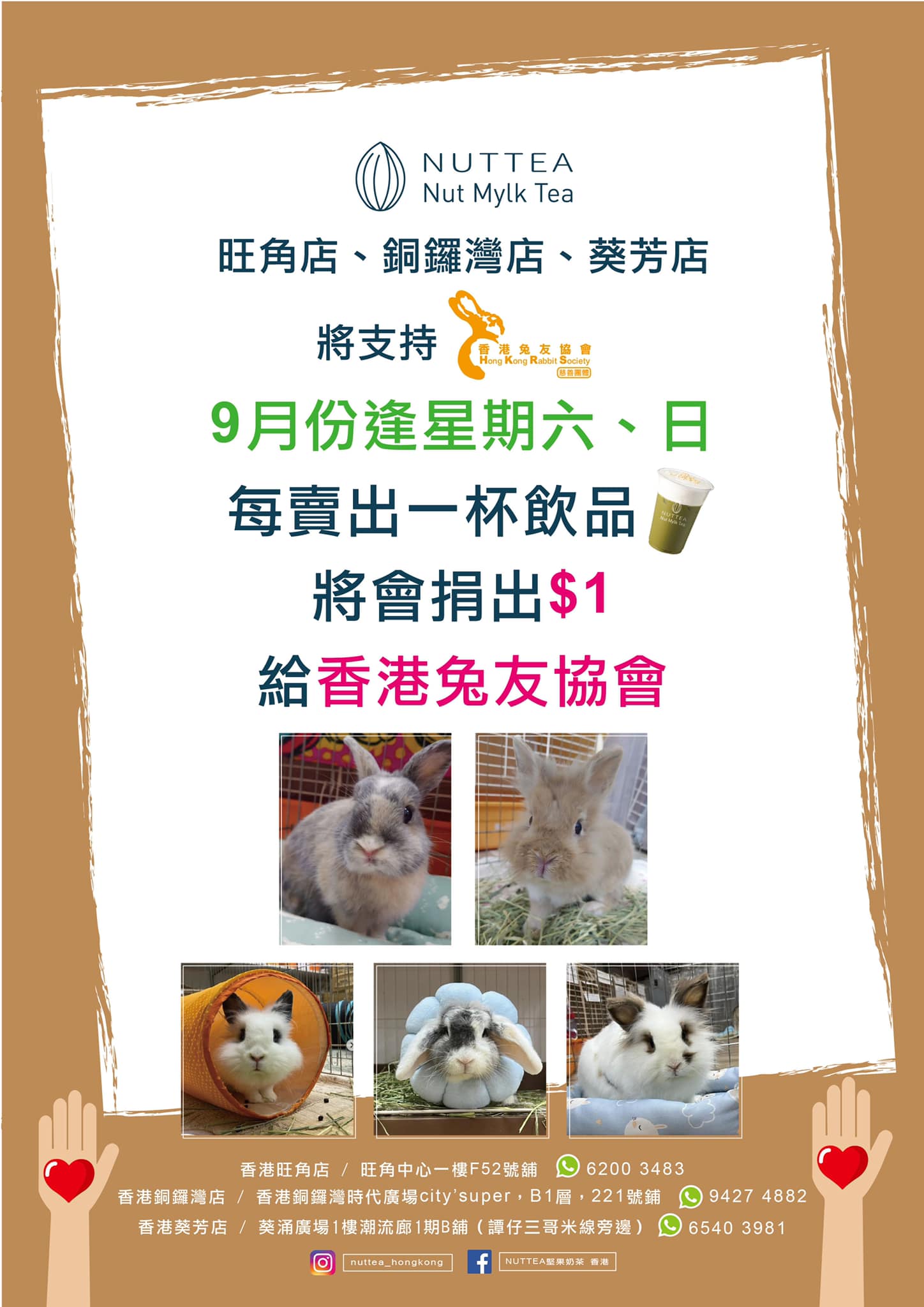 NUTTEA旺角店、銅鑼灣店、葵芳店 將支持香港兔友協會🐰💪🏻