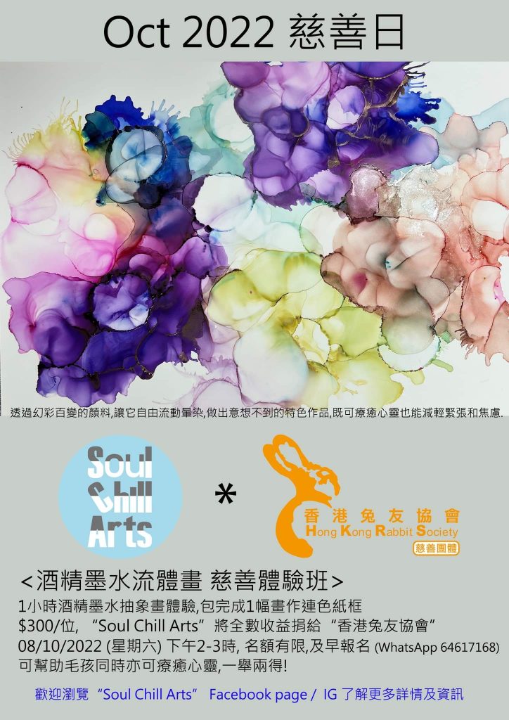 由 Soul Chill Arts 主辦的【酒精墨水流體畫慈善體驗班】收益全數撥捐兔協,有興趣的兔友請多多支持。