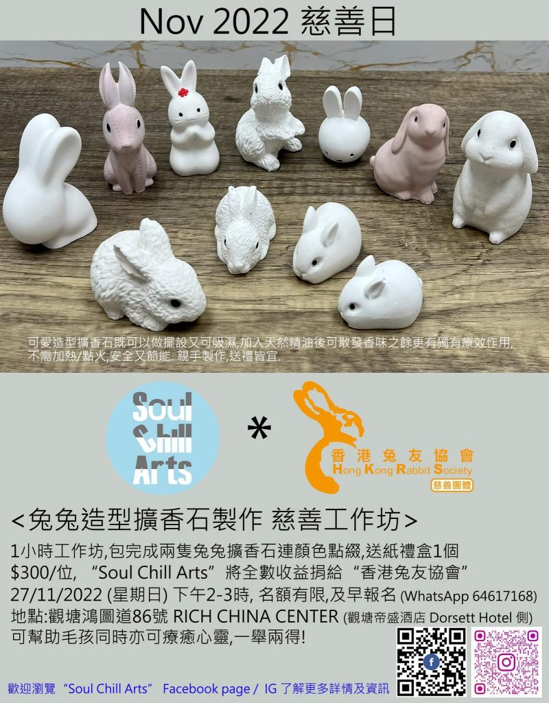 由 Soul Chill Arts 主辦的【兔兔造型擴香石製作 慈善工作坊】收益全數撥捐兔協,有興趣的兔友請多多支持。