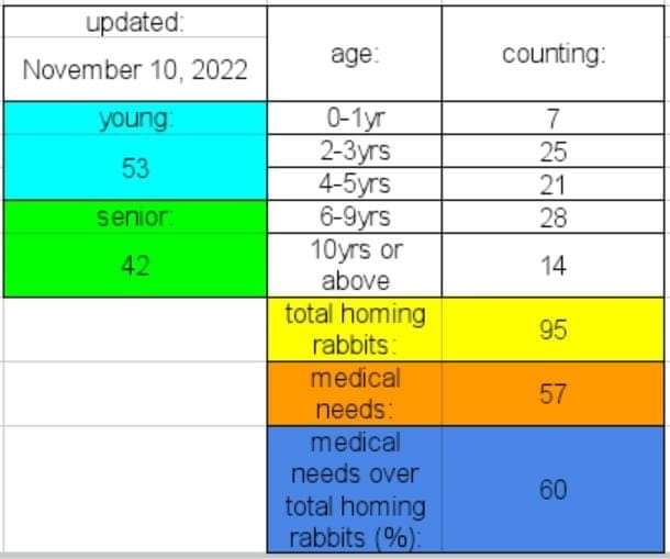 Maybe you haven’t noticed that in recent years, the situation of “abandoned rabbits” has become more and more serious. We currently have 95 abandoned 🐇🐇. There are 42 senior abandoned rabbits (over 6 years old) who are sick, and the incidence rate of illnesses of the senior rabbits is also higher. 57 of abandoned rabbits need to receive further medical treatment, and the regular medical expenses are more than $60,000 per month (Excluding the cost of sudden emergency surgery and hospitalization, the expenditure in this part from September to October 2022 has reached $350,000).
