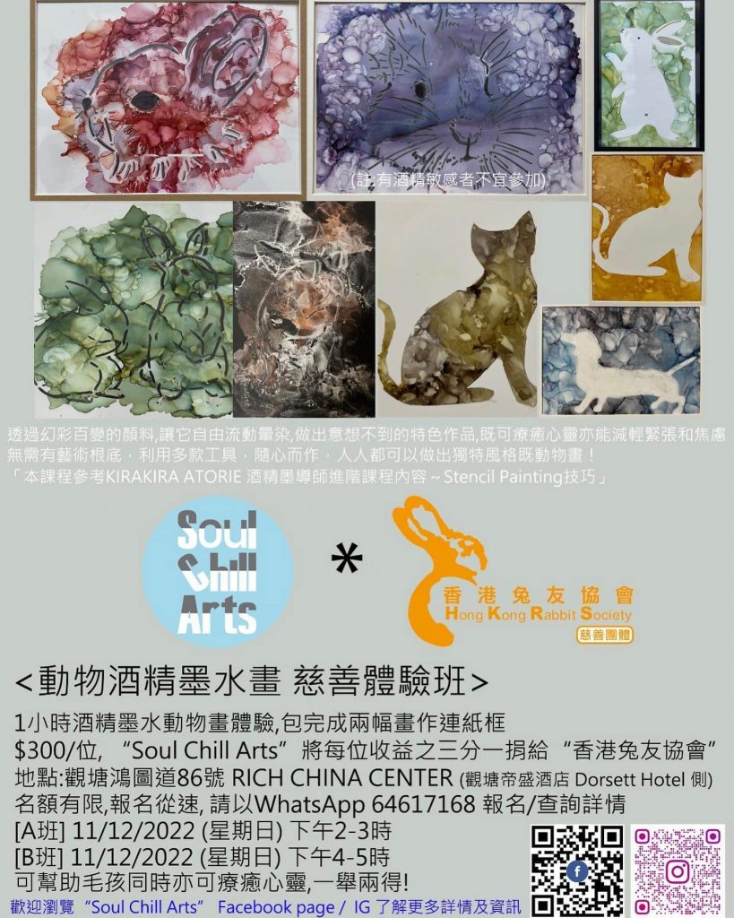 由 Soul Chill Arts 主辦的【動物酒精墨水畫 慈善體驗班】部份收益撥捐兔協,有興趣的兔友請多多支持。
