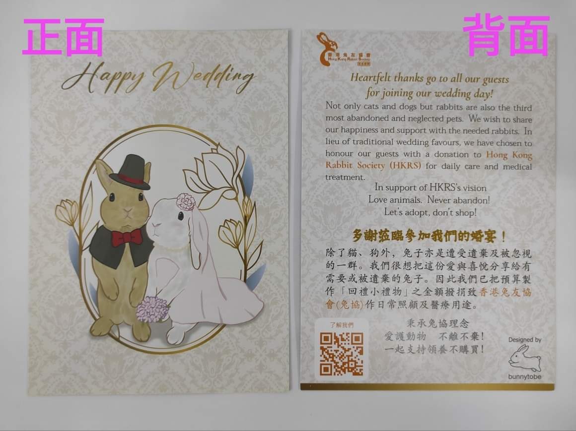 You two can turn the traditional wedding favours in the wedding banquet into a love donation to help the abandoned rabbits. We specially found a designer to design a unique thank you card for the guests, so that they can share the love brought by kindness. Love and warmth to help little fur kids who are waiting to be rehomed.
