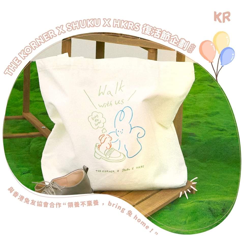 The Korner x Shuku x HKRS 好高興今次聯同香港女裝鞋履品牌 The Korner 和本地插畫人物 Albee Yau 合作,設計領養兔子主題的帆布袋。呼籲大家以領養代表購買,正視兔子棄養的問題。