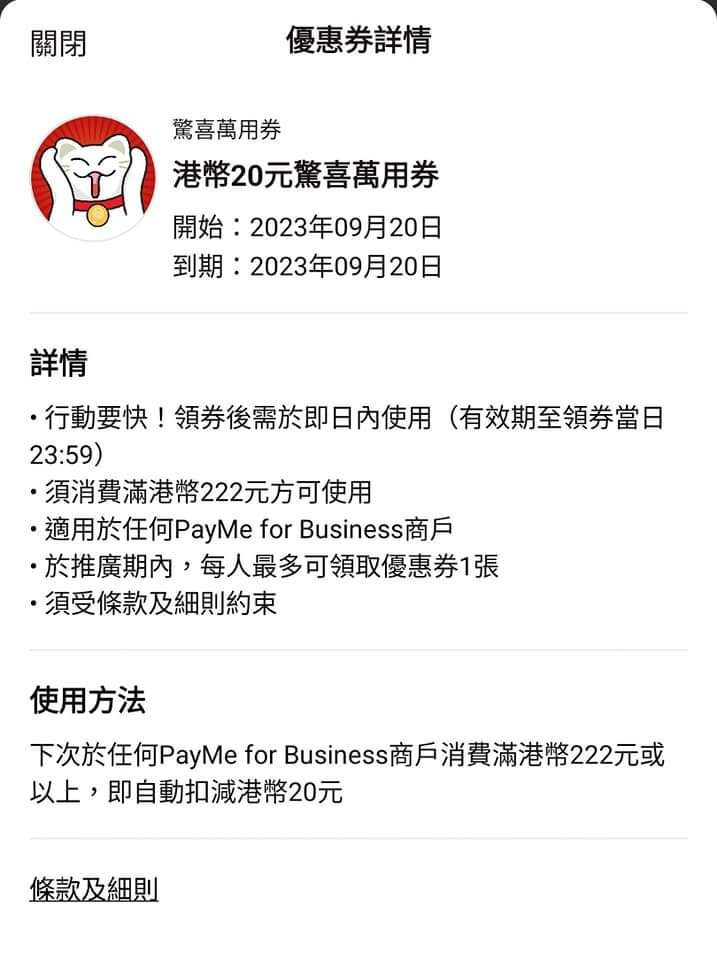 用戶成功搶券後,可於領券 *當日* 向任何PayMe for Business商戶消費並享折扣優惠,優惠金額將於用戶付款時即時自動扣減。 (詳情請參閱PayMe App刊登的內容和細則,一切以PayMe 條款為準)