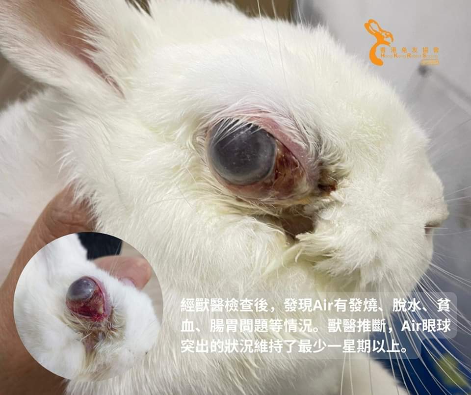 2. 根據獸醫的報告,Air的右上牙牙根斷裂,導致有傷口及形成膿包,將眼球推出。獸醫推斷,Air眼球突出的狀況維持了最少一星期以上,前主人在這段期間完全沒有為Air提供任何醫療及尋求協助,任由她承受痛苦。