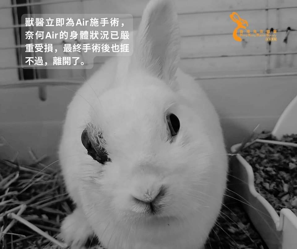 還記得去年底,被無良前主人放在一個密封膠箱,棄養在兔協門外的Air嗎?當時Air的身體狀況十分惡劣,右眼球嚴重突出,而且有發燒、脫水、貧血、腸胃問題等情況。即使我們立即帶Air前往獸醫診所施手術及治療,可惜Air身體已承受著太多病痛,手術後始終捱不過,離開了。