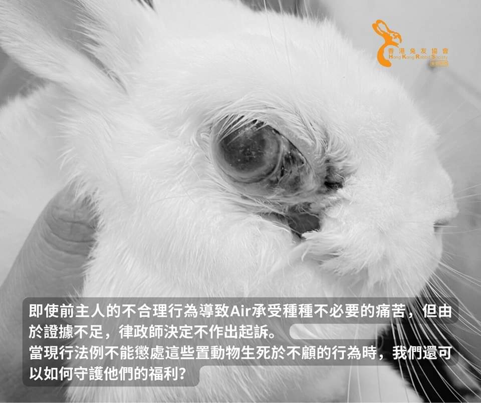 現時的《防止殘酷對待動物條例》的準則可謂十分寬鬆,對寵物飼主的責任及照顧行為要求極低,完全不能保障動物福利。兔協單單在2023年之內便接收了32隻被棄養的兔子,不少是由於疏忽照顧而導致嚴重受傷或患上重病,亦有被無良棄置的個案,既然法律未能懲處這些惡行,殘酷對待或疏忽照顧動物的人往往無需負上任何責任。我們只能繼續透過教育大眾正確飼養及照顧兔子的知識,一起合力守護兔子的福利。我們懇請大家與我們同行,向身邊的朋友宣掦正確的飼養兔子知識,支持領養代替購買,幫助更多有需要的兔子。