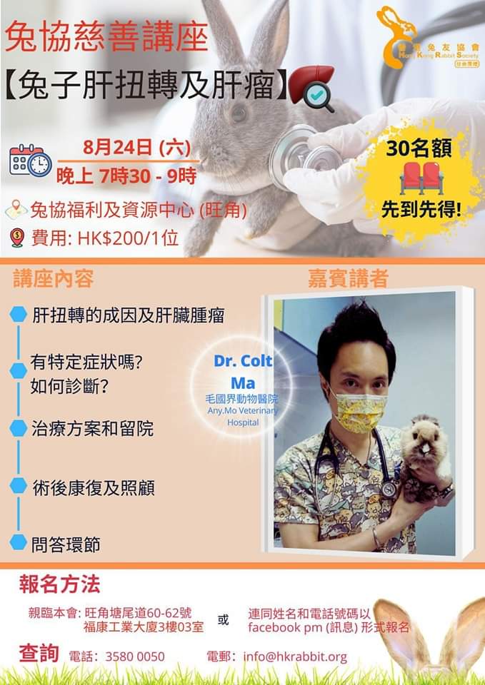 我們非常感謝 Any.Mo Veterinary Hospital 毛國界動物醫院 的Dr. Colt Ma 百忙之中抽出寶貴的時間來到兔協主講有關兔兔嘅肝扭轉問題!對於好多兔主人黎講經常聽到有兔兔唔食嘢,最後發現是肝扭轉需要做手術,又或者因為要做肝扭轉手術而要周圍搵兔輸血。肝扭轉係無得預防㗎,所以養緊兔仔嘅兔友們可以藉住今次的機會深入了解一下,歡迎你參加今次嘅慈善講座。詳情如下: