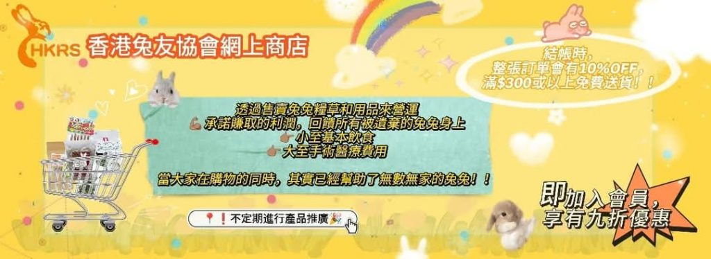 無錯!兔協網上商店購物享會員整張訂單10%折扣 (結帳時計算) ➕滿$300免費送貨🚚,讓你輕鬆囤草糧玩具,同時支持兔協照顧被遺棄兔寶!從日常膳食到緊急醫療,你嘅每一蚊消費都能化成溫暖援助~