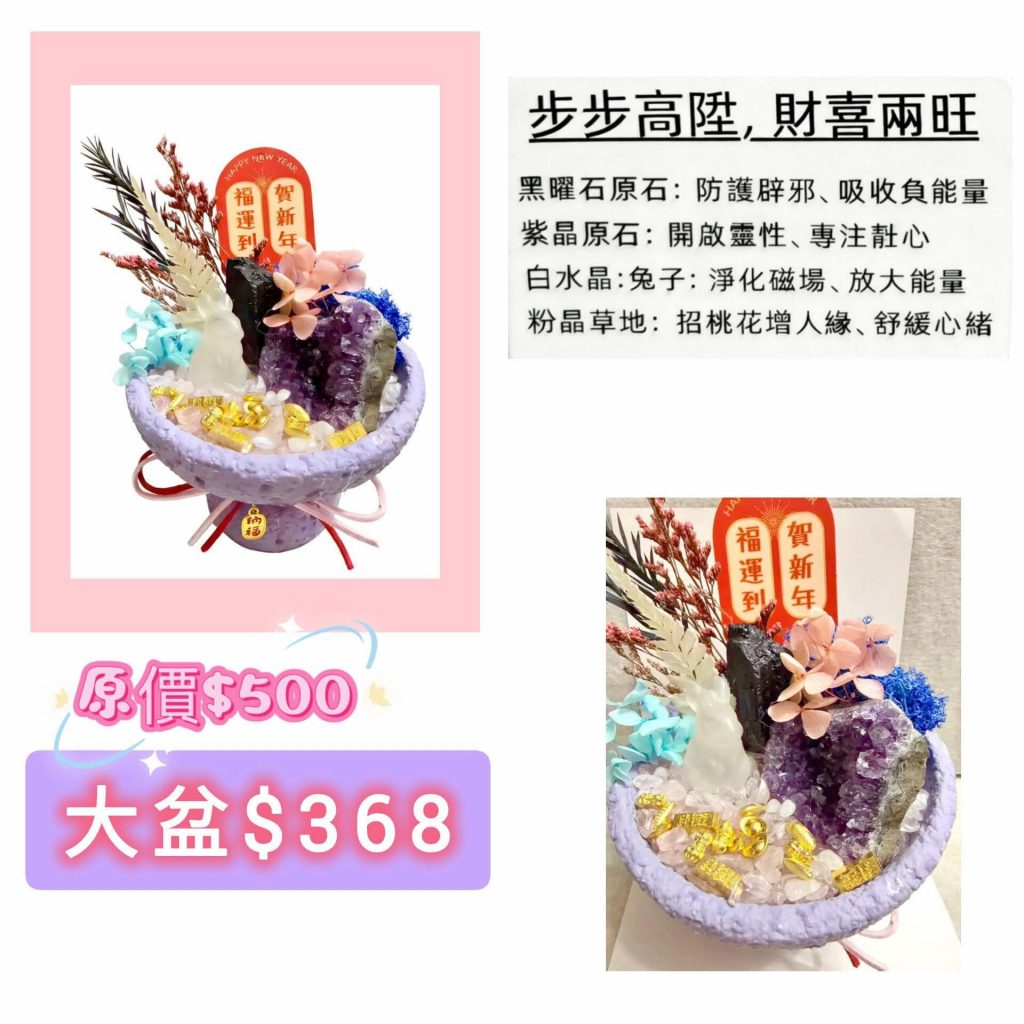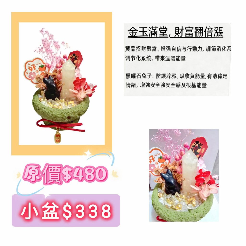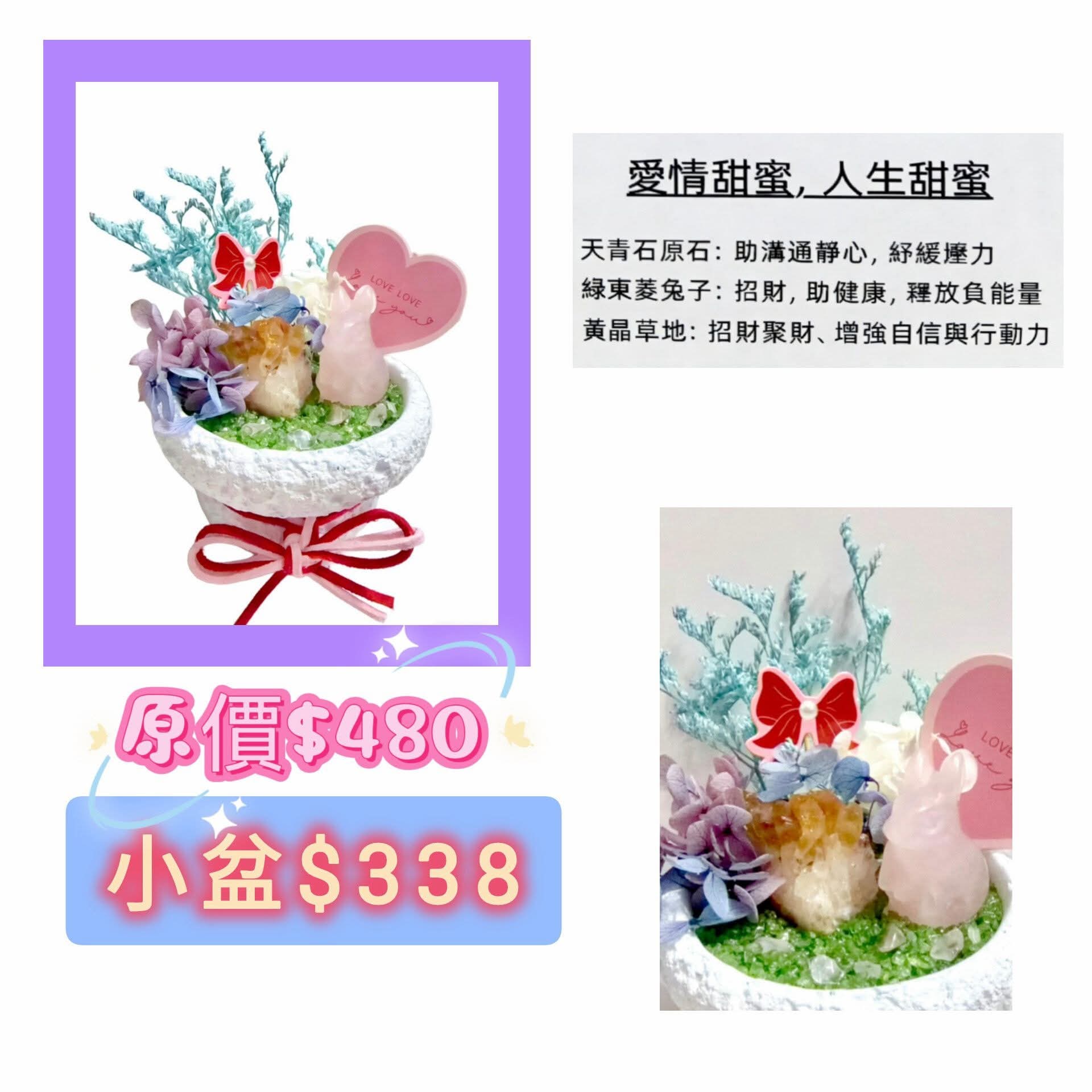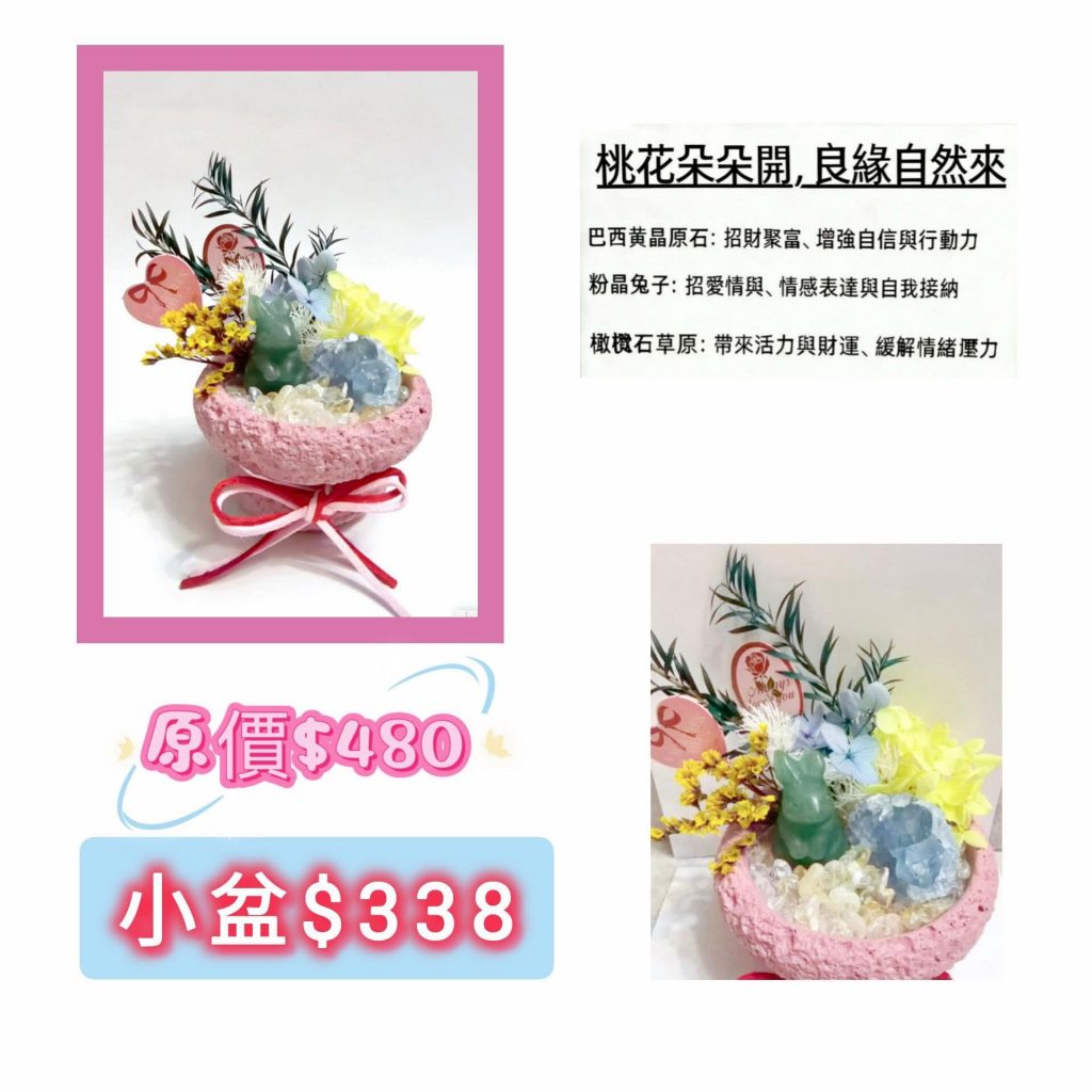 每盆均搭配不同水晶﹑兔子水晶擺件及永生花,具有不同寓意。