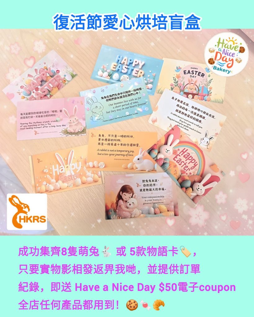 #HKRS #兔協 #HaveANiceDayBakery #復活節盲盒 #手工曲奇 #雪花酥 #幸福萌兔 #兔兔物語卡 #支持兔兔 #電子Coupon #挑戰手氣
