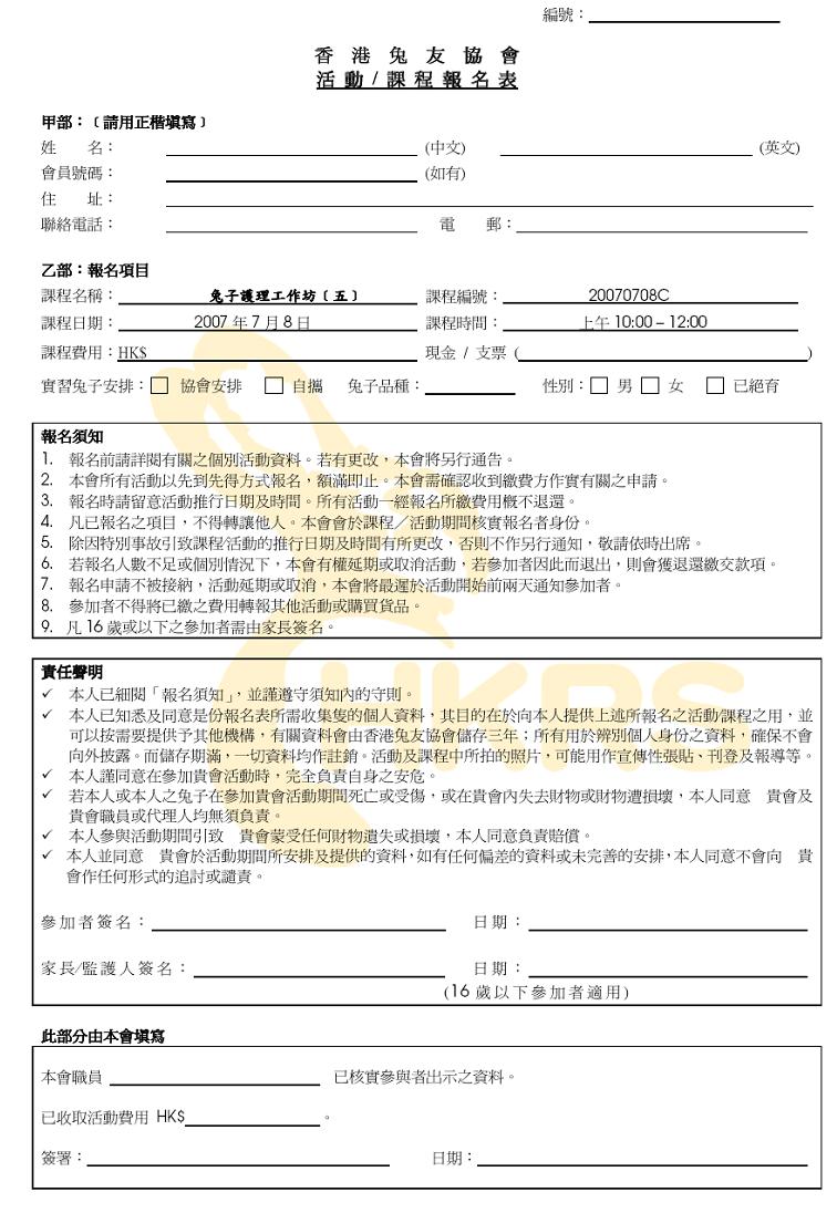 有興趣參加工作坊的會員,請填妥報名表格,連同有關費用郵寄或親身遞交予本會,支票抬頭為”香港兔友協會有限公司”。名額有限,請儘早報名。如有任何查詢,歡迎電郵info@hkrabbit.org與我們聯絡。